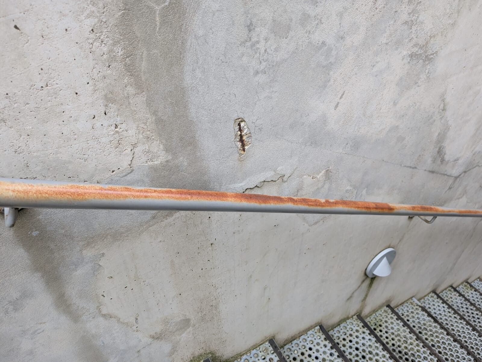 Un éclatement du béton avec mise à nu des armatures est observé, accompagné de traces d’oxydation.