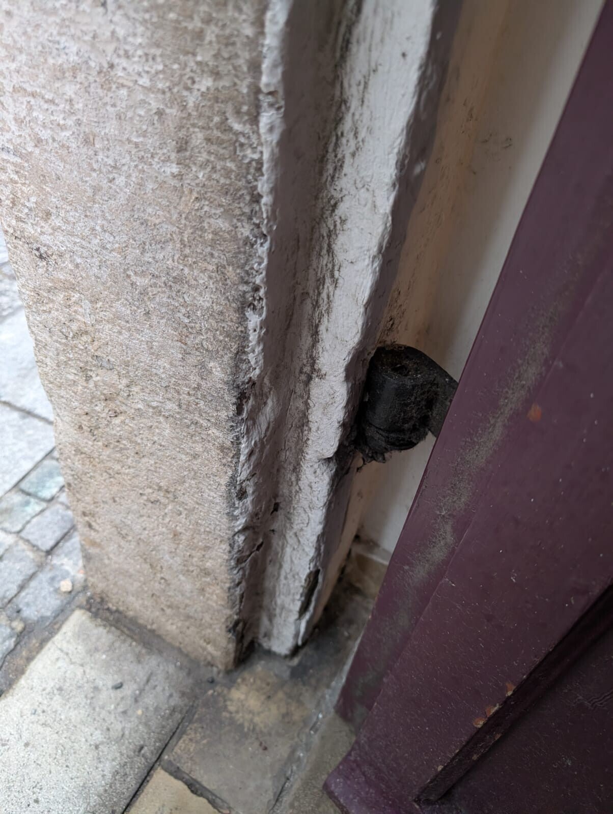 Une dégradation de l’enduit est observée au droit du tableau de porte, particulièrement en partie basse.